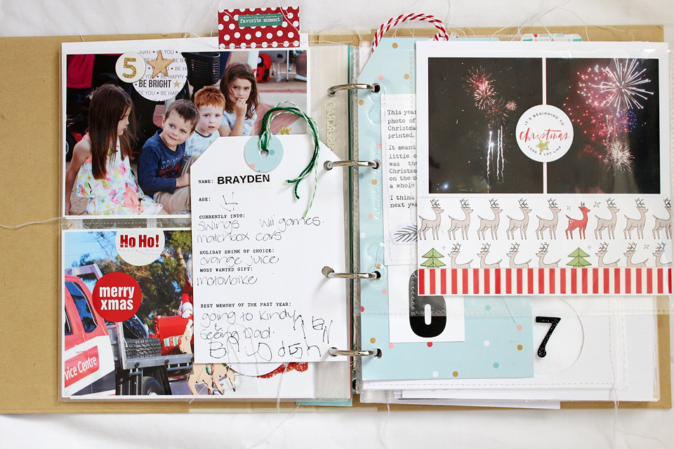 In the middle of this spread is Braydens little 'interview' card.... there were a lovely little free printable from Ali Edwards and I have included a card for the 3 little ones this year.